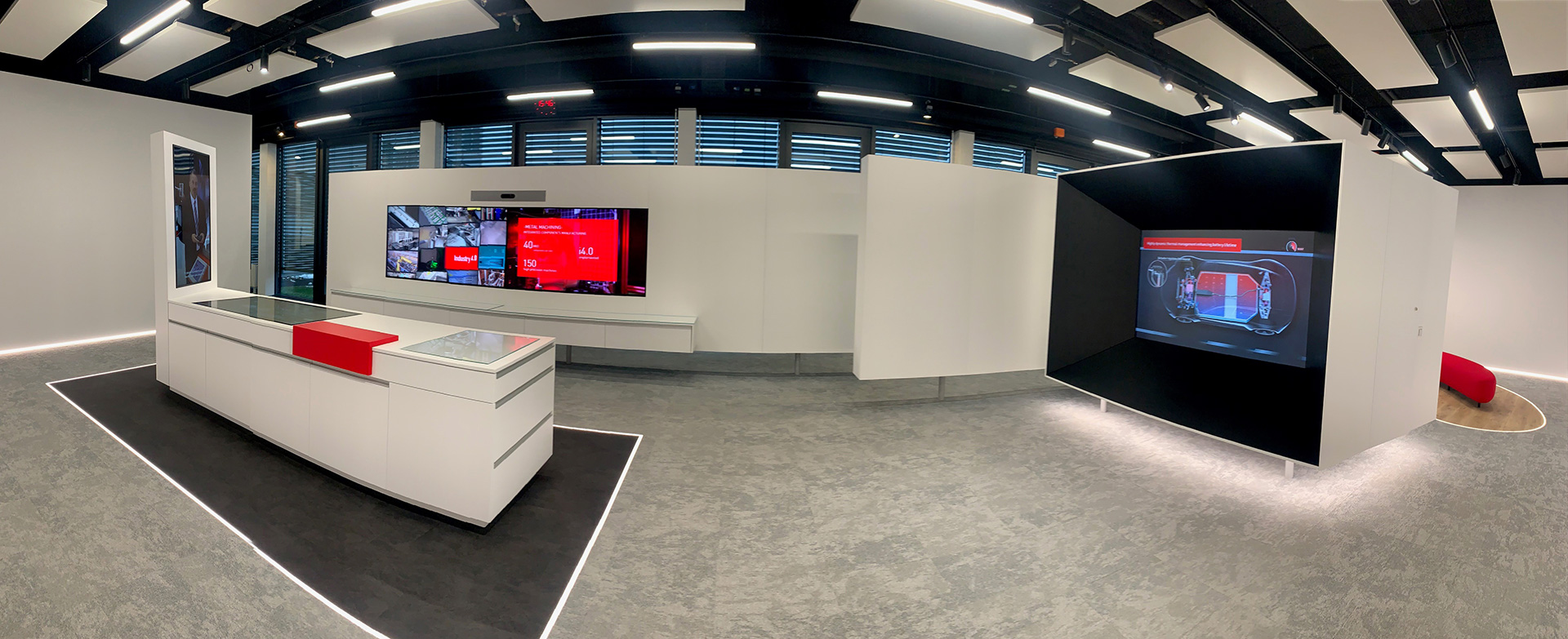 Les visiteurs sont accueillis par un écran d’accueil personnalisable. Ils parcourent ensuite les différentes zones du showroom. Grâce à une interface simple et intuitive, une tablette tactile permet de contrôler en temps réel les différents écrans et projecteurs. Elle comprend un plan interactif de la salle et un menu de sélection média, organisé par catégories et sous-catégories. Pour simplifier le travail des guides, des scénarios de visite préconfigurés avec des sélections de contenus prédéfinis sont disponibles pour les différentes divisions de l’entreprise. Un CMS flexible permet à l’équipe de Sonceboz de personnaliser et mettre à jour le contenu en toute autonomie.